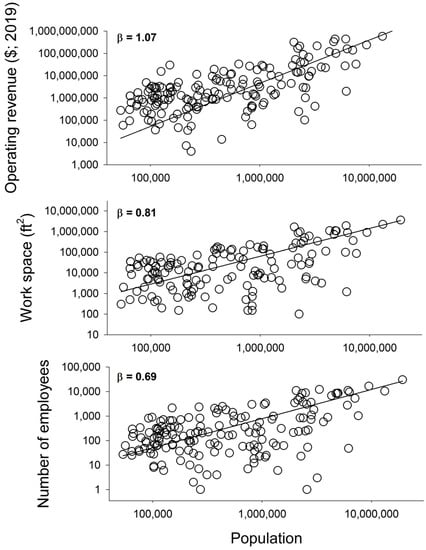 Scaling of cultural footprint metrics (operating revenue (top panel), work space (middle panel), and number of employees (bottom panel)) with population of metropolitan statistical area. All regression slopes are significantly different than 0 (p < 0.001). Operating revenue power exponent (β = 1.07) is not significantly different from 1. Exponents for space (β = 0.81) and number of employees (β = 0.69) are significantly less than 1.