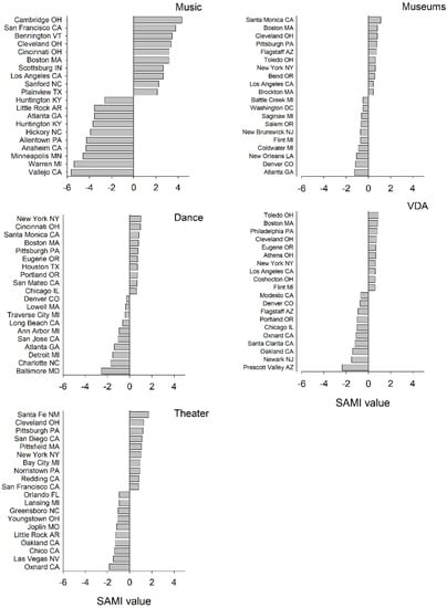 SAMIs (Scale-Independent Metropolitan Indices) differed between specific arts disciplines (Figure 2). Music organizations were, by far, characterized by the largest spread between the top 10 over-performing metro areas (i.e., greater operating revenue that predicted based on population) and the bottom 10 under-performing areas. The same large range was not observed for the other arts disciplines or museums. Boston, Cleveland, and New York City were in the top 10 SAMIs for four of the five arts disciplines. Los Angeles and Pittsburgh were in the top 10 of three of the arts disciplines. Atlanta and Denver were both in the bottom 10 of three of the arts disciplines. Little Rock (AR), Oxnard (CA), and Oakland (CA) were in the bottom 10 of two of the arts disciplines.