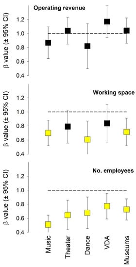 The operating revenues of the four arts disciplines (music, theater, dance, visual and design arts) and museums scaled linearly with population (i.e., β value not significantly different from 1; Figure 3). With the exception of the working space of theater and visual and design arts, the total number of employees and work space of museums and arts disciplines scaled sub-linearly with population.
