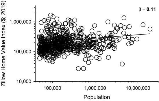 Prior studies have demonstrated that MSA functional characteristics can be represented as power law functions of population size [,]—Y = Y0 × Pβ, where Y is the modeled characteristic, Y0 is a scaling constant, P = MSA population, and β is the scaling exponent. The β value characterizes the sensitivity of a metric to increases in population size (i.e., the metric’s elasticity). A β value < 1 (sub-linear scaling) is typically associated with infrastructural economies of scale (e.g., road surface area). A β value = 1 (linear) describes population needs and amenities (e.g., number of dwellings), while β > 1 (supra-linear scaling) characterizes generally productive measures, such as gross domestic product or patent production, which increase faster than population. MSA population was plotted against the sum of each metric for that MSA, and a two-factor power model was used to estimate β, as well as the associated error of the estimate. Scaling exponents were then tested against β = 1 (linear scaling) to determine the class of behavior (i.e., sub-linear, linear, or supra-linear).