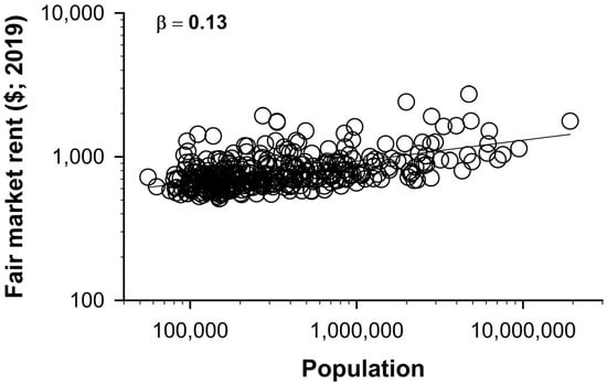 Cost of living, defined by housing costs, was only mildly influenced by metro population. Real estate values for mid-tier single-family homes increased sub-linearly (β = 0.11) as MSA population increased (p < 0.001; Figure 4). Similarly, fair market rent estimates increased sub-linearly (β = 0.13) with population size (p < 0.001; Figure 5). A ten-fold increase in population predicted only a ca. 40% increase in housing costs, compared with a predicted 12-fold increase in operating revenue.