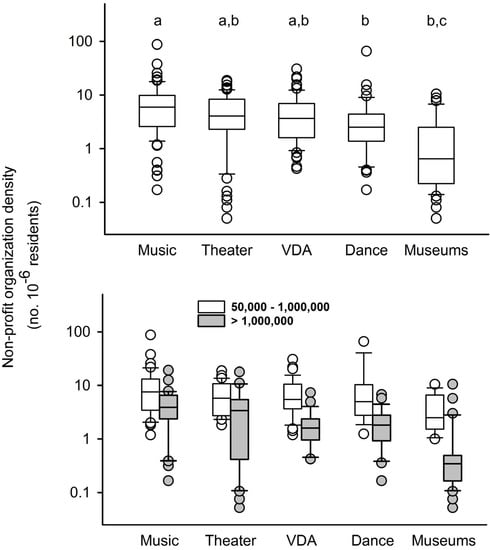 This research bridges the gap between an easily measured variable (population) and predictions that may guide more efficient use of resources. Mid-size and large cities were compared as cultural repositories for four arts disciplines (music, visual and design arts, theater, dance) and museums, the sub-CCI units Li [] identified as in need of more study. The density of arts opportunities for urban dwellers and the economic footprint of non-profit arts institutions were also compared for large (>1 M residents) and mid-sized (50 K–1 M residents) MSAs.