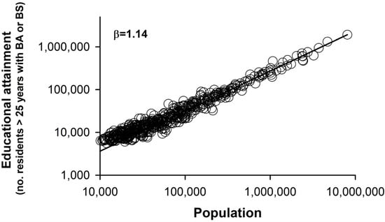 Educational attainment, measured as the number of adults above 25 years old, scaled positively and supra-linearly (β = 1.14) with city population (Figure 7). These results were also apparent for the highest educational attainment; adults having earned a graduate or professional degree also scaled supra-linearly with MSA population (β = 1.13; not shown).