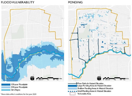Sunnyside, the application case site for this research, is a community with a rich culture and shared values but has also suffered from a myriad of problems including inadequate infrastructure investment, limited access to economic resources and affordable housing, low-quality open spaces and transit options, public safety, vacant lands, and increasing risks to flooding hazards. A large proportion of the neighborhood’s parcels are designated as being in the 100- and 500-year floodplains, with frequent ponding issues after heavy rainfall or storm events (Figure 2). For example, the Draft Action Plan for Disaster Recovery [] estimated USD 545 million of housing and infrastructure damages in Sunnyside from the 2015 Memorial Day and Halloween storms combined. This plan shows that flooding coincided with the open ditch locations in Sunnyside. Impervious surfaces and inefficient placement of existing parks make water absorption and filtration difficult. The combination of open ditches and vacant lands exacerbates water ponding problems while making these areas susceptible to the disposal of waste, broken furniture, discarded appliances, and debris.
