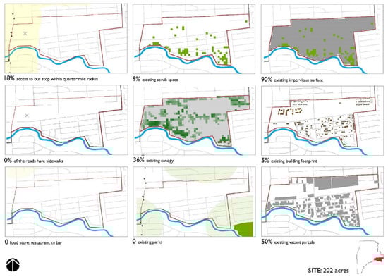 Through this process, we identified critical environmental and infrastructural problems to be targeted in this engaged research: (a) major concentrations of vacant parcels, (b) frequently affected by flooding and stormwater ponding, (c) lack of public amenities, and (d) a high need for increased GI. For example, only 18% of the area was within a quarter-mile radius of a bus stop. There were no existing sidewalks and the open ditches along the streets created a sanitary hazard. Around 9% of the site was considered underutilized space with no community use. The existing tree canopy covered 36% of the site, but there was no park facility. A majority of the site’s parcels were vacant or abandoned (Figure 3). Using the identified issues, goals were set for the subsequent master planning, including repurposing vacant land, providing green infrastructure for stormwater capture and carbon sequestration, as well as reducing non-point pollutants.