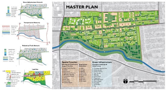 The final master plan for Sunnyside focuses on green infrastructure for ecological benefits but also achieves multifold co-benefits, including housing and community support and employment generation (Figure 4). The developed plan includes a new green infrastructure network, which is a connected set of open spaces to improve urban stormwater management and water quality. For example, Sunbeam St, acting as an eco-boulevard, traversed the center of the site connecting the area to the primary arterial roads to the west and east. Pedestrian trails were also interwoven through the green infrastructure network, increasing pedestrian access to adjacent land uses and facilities.