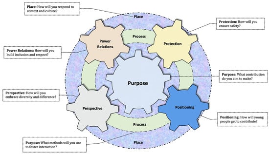 Cahill and Dadvand [13] draw upon critical theory, feminist literature, and youth studies to present the 7P model. Their machinelike depiction of seven dynamic and interactive elements—Purpose, Positioning, Perspectives, Power Relations, Protection, Place and Process (shown in Figure 1)—can be used to “think through” youth participation from a variety of angles. In addition, they discuss each “P” in turn, propose prompting questions, and provide illustrative examples, creating a model which moves youth participation theory forward in its consideration of structure, agency, and power. We thus deem the 7P model to be the most able to account for sociocultural context and power dynamics in our study.