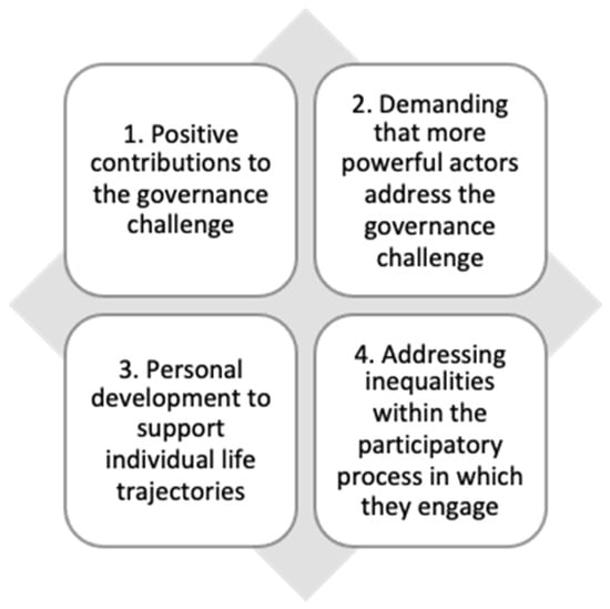 The four purposes in Figure 2 are numbered for ease of reference, but this does not reflect any hierarchy or prioritisation. Furthermore, although we focus on purposes pursued in the UNFCCC (represented by the diamond shape), youth participants also pursue these goals beyond UNFCCC spaces, as depicted. Future research could develop and test these purposes driving youth participation in other contexts, drawing upon related typologies within youth studies [45], environmental governance [46], or psychology [47]. We suggest that only the first purpose aligns closely with the UNFCCC’s goal of mobilising NSA contributions to government-led action, and only the first two directly address the governance challenge at hand (i.e., tackling climate change). The third purpose reflects the relationship between young people’s everyday lives, life trajectories, and participatory experiences, which is often overlooked in youth participation models and environmental governance studies alike but is an important part of the picture. Indeed, youth scholars emphasise that young people’s participatory experiences are shaped by their daily lives and transitions to adulthood [20,21,22], yet we believe the 7P model is the first to effectively capture this.