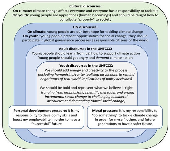 Within the UNFCCC, we found that youth participants were not as commonly positioned as the “heroes” or “protagonists” in climate action, in contrast to the narratives applied to the youth climate movement outside of the UN negotiations [5]. However, the moral pressure to act was still prevalent. Positioning can also have negative consequences on young people’s physical and mental health, as they struggle to live up to these conflicting expectations, as also found amongst youth participants in climate protests outside of the UNFCCC [33].