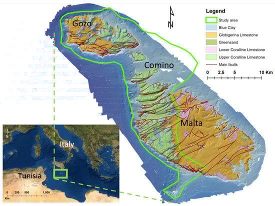 The study area is located on the Maltese Islands, central Mediterranean Sea, and comprises the entire islands of Gozo and Comino and approximately half the main island, Malta. Despite the archipelago reaches one of the highest numbers of population density in EU, i.e., over 1500 habitants per km² for a total population almost 516,100 as of December 2020 [32], the study area is sparsely inhabited since it does not include the most urban sector situated in the Northern Harbour and Southern Harbour of Malta [33]. However, the population is projected to increase further to 706,915 persons by 2070 [20], and the archipelago also attracts a high number of tourists, currently standing at 2,771,888 in 2019 [34,35], thanks to its mild Mediterranean climate and rich historical heritage. The study area is composed of a marine sedimentary rock sequence ranging in age from Upper Oligocene to Upper Miocene that consists of limestones, marls and clays, which are ca. 250 m thick (Figure 1). In addition, a discontinuous layer of quaternary deposits is found on the archipelago [36,37].