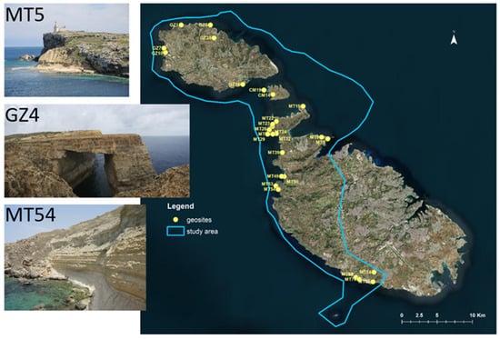 The methodology was applied on 27 geosites located on the Maltese Islands, a small-island state that counts 271 km of shoreline. Given its geographical location in the Central Mediterranean Sea, the archipelago is exposed to several hazards and threats, with a generally low to medium risk level [92].