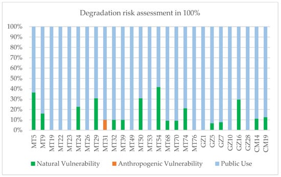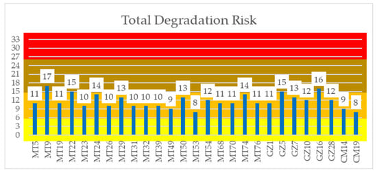 The 27 geosites identified in the Maltese Archipelago have been assessed through the methodology described in paragraph 3.1 (Table 4) in order to define their degradation risk, and the results are presented in Figure 3.