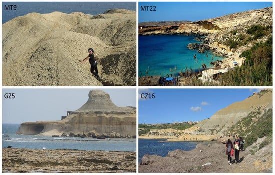 - Barbieri, M.; Biolchi, S.; Devoto, S.; Forte, E.; Furlani, S.; Gualtieri, A.; Mantovani, M.; Mocnik, A.; Padovani, V.; Pasuto, A.; et al. Multidisciplinary Geological Excursion in the Open-Air Laboratory of the Island of Malta, 11–18 November 2010 Field-Trip Guide; Dipartimento di Scienze della Terra, Università degli Studi di Modena e Reggio Emilia: Modena, Italy, 2010. [Google Scholar]