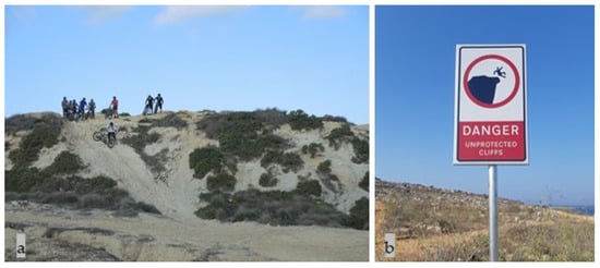 Examples of incorrect public use in the Maltese coastal geosites: (a) cycling activity on Blue Clay slopes; (b) absence of physical protection and control of access along the geosites on the coast.