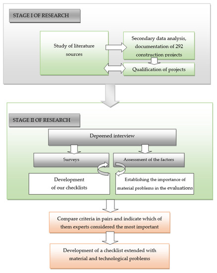 The research performed in its first stage led to establishing a sample of a checklist thatprovides an ordered approach to qualification of construction projects with regard to a significant impact on Natura 2000 areas. The second stage led to establishing a checklist expanded by the materials and technological issues. Figure 4 presents the scheme of the research.