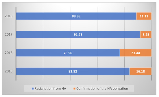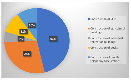 The region of north-eastern Poland has remained in the category of the least attractive for investment for years [46]. This position is, first of all, the consequences of long-term socio-economic processes. Despite the progress in expanding and modernization of the infrastructure of the national rank, the region is still characterized by inadequate transport access. The low attractiveness for investments of the region means that it stands little chance to draw large-scale investments. It can be enhanced by strengthening attractiveness for investment for activities related to unique resources and assets of this (protected and naturally valuable areas).In this region, partially or astheir whole, there are 16 areas of special bird protection (covering 575.809 ha) and 43 areas of significance to the Union (covering 258.190 ha). In total, the areas of Natura 2000, including their shared parts, cover 664.990 ha, i.e., 27.6% of the region. The course of HA is supervised by the Regional Director of Environmental Protection in Olsztyn (RDoEPiO). It is a specialized organization for controlling investment processes in respect of environmental protection. Figure 2 shows what the RDoEPiO’s decisions were in the years of 2015–2018, confirming the obligation to make HA for construction projects thatcannot significantly influence the environment (in Poland, so-called group III).They concerned different kinds of construction projects (cubature objects, land, and water engineering constructions, etc.) of different impact scales (single buildings or their complexes) as well as of different property status (private and public investments). In the category of investments subject to the HA obligation, the greatest number constituted SFRs (Figure 3). This fact confirms the trend of the increasing popularity of investment in the areas ofhigh-level environmental protection, which has remained for several years [40,44]. Valuable, natural areas are enjoying growing popularity among individual investors who want to relax from the urban bustle.