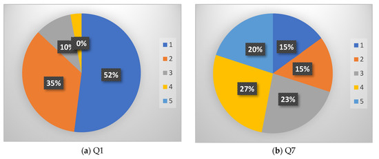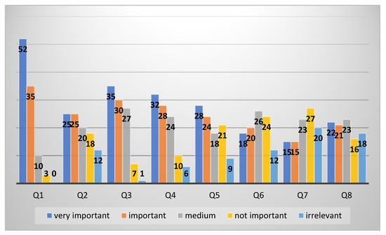 It may also be interesting to analyze the distribution of specific answers to the aforementioned questions. In order to illustrate this, the distribution of “very important”responses is shown in Figure 7. There is a clear predominance of Q1 indications as a very important problem, and the remaining percentages of responses are consistent with the preferences specified in previous studies.