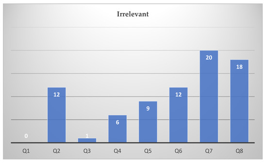 The next illustration in Figure 9 shows the distribution of “irrelevant” ratings. Here, as in the “very important” ratings, we can clearly see greater agreement in the experts’ ratings. The lowest rated questions Q7 and Q8, which were in the last positions in the ranking, received the most answers describing them as irrelevant.