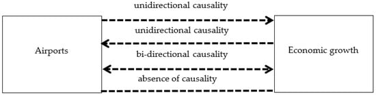 Providing empirical support for the direction of causality between the development of air services and regional economic growth has important policy implications for governments in the development of air transport infrastructure along with its link to regional economic policies. There are four main types of causal relationships between airports and economic growth [7]. The arrows indicate the direction of the impacts, as shown in Figure 1.