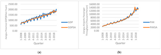 (a) Quarter data of GDP, GDPSA of Jiangsu; (b) Quarter data of PAX, PAXSA of Jiangsu.
