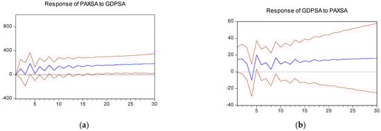 (a) Impulse Response of PAXSA to GDPSA; (b) Impulse Response of GDPSA to PAXSA. The blue line was the impulse response estimate for the horizon period, and the two red lines were the one-standard error confidence bands.