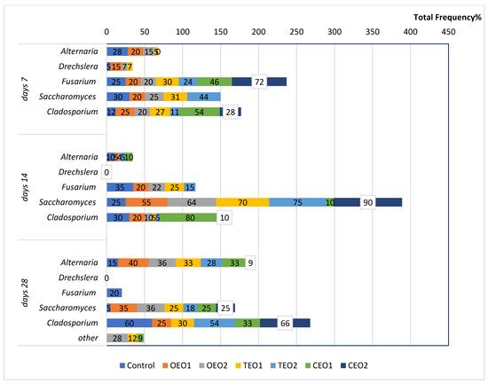 After 28 days the fungicidal effect of EOs is noticed for Drechslera and Fusarium which appear only in the control version. Alternaria reappears in all treatment variants alongside Saccharomyces and Cladosporium. Cladosporium is the genus with the highest frequency value of 268%.