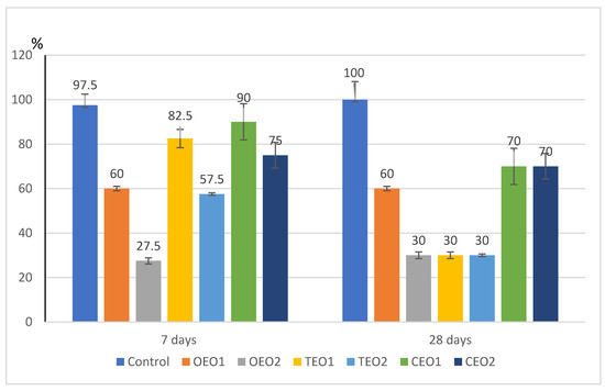 The effects of EOs fumigation after 28 days decrease compared to the effect after 14 days but show an essential percentage of inhibition related to the control for which the DON content increases by 28.99% compared to the initial one. For all EOs analysed, the inhibitory effect was resisted after 28 days. The values vary between −25.74% in the case of fumigation with CEO2 and −64.65% for TEO1, according to Figure 3.