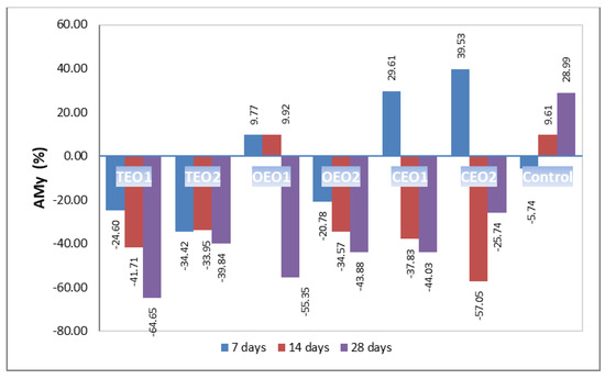 Amplitude of DON (AMy, %) at 7, 14 and 28 days from seeds wheat storage in an atmosphere enriched with essential oil vapours. EOs concentrations are OEO1, TEO1, CEO1 = 0.2%, OEO2, TEO2, CEO2 = 0.4% calculated for the volume of air enriched with essential oil vapours.