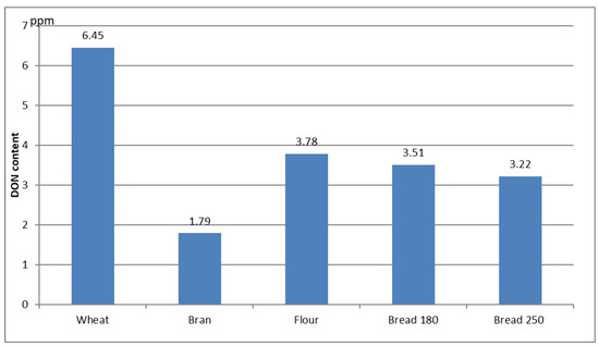 Figure 4 presents the DON content in the derivative products. The experiment was performed on the control sample naturally contaminated with DON (6.45 ppm) to highlight the transfer of DON occurring naturally in wheat in the endosperm and bran and the influence of heat treatment (baking) on the DON content in bread.
