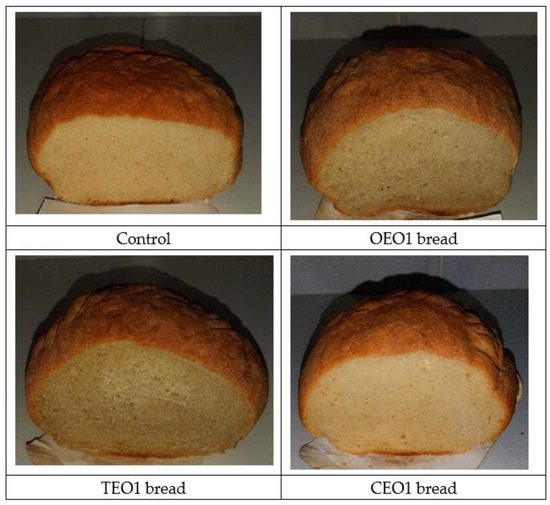 At 97 g flour obtained as above, 67 g of water and 2 g of yeast were added in granular form. The mixture was maintained for 20 min at room temperature and kneaded the dough again for another 8 min. The dough was left to ferment for 30 min at room temperature (23 °C), respectively, until the dough volume increased twice. This process was followed by modelling two buns weighing 83 g each and kept to the final fermentation (20 min). After baking, two bread buns weighing 62.95 g resulted for each EOs vapours treatment.