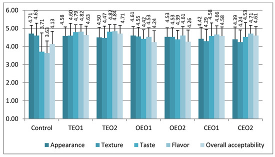 Figure 6 shows the sensory evaluation results as mean and standard deviation differences. The most highly appreciated was TEO2, with 0.2% Thymus vulgaris oil, which obtained mean scores of 4.711 for overall acceptability, 4.842 for flavour and 4.816 for taste, falling within the 4.00–5.00 score range, which indicates high acceptability.