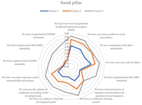 Figure 1 depicts the isolated clusters representing separately the social, environmental and economic pillars of sustainable development. The next step involved using ANOVA to confirm differences between clusters based on the level of sustainable development solutions and the actions implemented. Considering all clusters, ANOVA confirmed statistical differences between all sustainable development factors (p < 0.000 in all cases).
