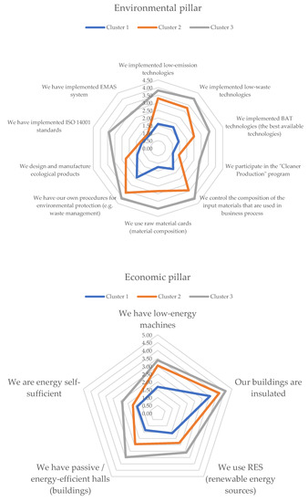 Next, k-means clustering was conducted using SPSS software to isolate types of business entities that represent various levels of implementation of particular sustainable solutions and actions. We isolated three clusters using the lowest value of Davies–Bouldin’s index calculated for our sample divided into three, four and five clusters [111]. Table 2 presents the clustering results.