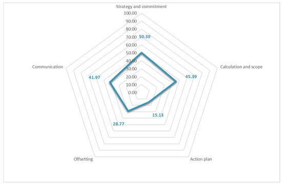 As can be seen in Figure 1, the sector with the best performance regarding neutrality objectives and practices is the energy sector. This reflects the urgency of the transition from fossil fuels to renewable sources for this sector, as well as the impact of local and international regulation of climate change mitigation. Furthermore, the energy sector receives a high score in strategy and commitment but has a long way to go in translating its objectives into well-structured action plans in order to meet the objectives. This sector’s lowest scores are for calculations (scope 3 of the carbon footprint) and offsetting. Due to the enormous challenge that climate change poses for the energy sector, it is essential to ensure that these commitments and actions are effectively implemented in practice and not just outlined in public documents.