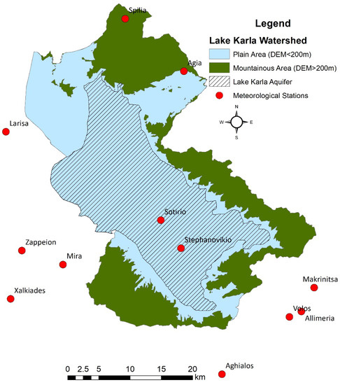 Monthly precipitation and temperature data of 12 uniform distributed meteorological stations across the watershed were available for the period October 1960 to September 2002 (Figure 2). Hence, monthly areal precipitation and temperature of the basin were estimated by the Thiessen polygon method, modified by the precipitation/temperature gradient, using the stations which are within or in the vicinity of the watershed (Figure 2). Potential evapotranspiration was estimated using the Thornthwaite method, based on areal monthly temperature values. Figure 2 also shows the Lake Karla plain and mountainous areas, based on an elevation threshold of 200 m, which demonstrates that the Lake Karla aquifer is situated on the plain area.