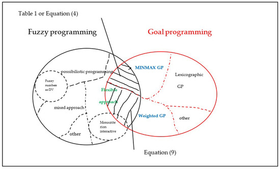 However, in this article, the authors deal with the flexible programming and its link with the GP (dashed area in Figure 2). It is obvious that GP and fuzzy programming are not identical, though the two approaches can be used in the case of flexible programming under the aforementioned approaches regarding the allowable diversions. Therefore, if the exceedance and the shortage from the ideal values are selected as the width (or tolerance) of the fuzzy constraints, then the flexible approach and the MINMAX GP are identical. Furthermore, it is proposed that these tolerances be established based on the pay-off matrix.