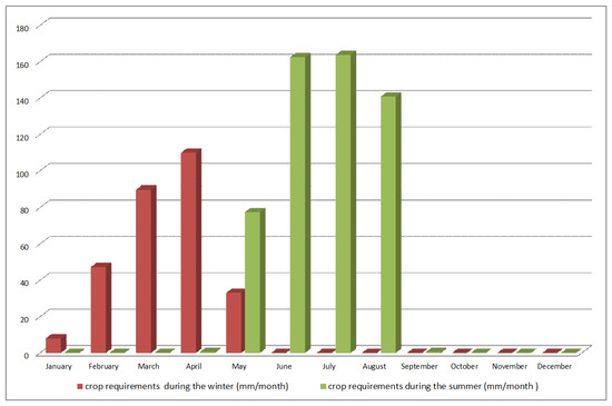 The agricultural water requirements of the summer crops are calculated by the authors based on the current allocation, and the proposed winter crop requirements are based on the Blaney-Griddle method, taking into account the effective rainfall [49]. Summer crop requirements were calculated based on localized data and coefficients [50].