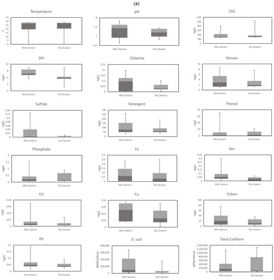 The temporal trend of the Opak sub-watershed was classified based on the season from 2013 to 2020. As explained by the Meteorological, Climatological, and Geophysical Agency (BMKG) of Yogyakarta Province [30,48], in Table 2, the wet season (or rainy season) peaked in February/March and the peak of the dry season was in September/October. Furthermore, water quality parameters were clustered into a gradual decline and rising in median parameters from the wet to dry season. The trend of decreasing median parameters from wet season to dry season includes temperature, pH, TDS, DO, chlorine, nitrate, sulfide, detergent, phenol, phosphate, Fe, Mn, Cd, Cu, Pb, colour, E. coli, and Total Coliform. On the other hand, there is the increasing concentration of water quality parameters, such as TSS, BOD5, COD, nitrite, ammonia, oil and grease, and zinc (Zn).