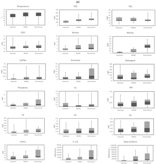 The spatial tendency of water quality in the Opak sub-watershed: Trend of increasing median parameters from upstream, middle stream, and downstream, respectively (a) and random trend of parameters from upstream, middle stream, and downstream (b).