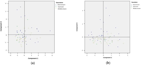 The selected components were loaded in the scatter plot imagined in Figure 6 for each location of the sub-watershed. In Figure 6a, the dots are centered in negative value both an x-axis and y-axis tend to disperse in a horizontal line (Component 1). The purple triangle (downstream), the green triangle (upstream), and the brown circle (middle stream) were represented by organic contaminants from domestic activities. It can be seen in Figure 6b, the points are more aligned with the x-axis than the y-axis, not only in the positive value but in the negative values. Most middle and downstream scatters represented component 2 (industrial activities) since the heavy metal was the primary source. As well as Figure 6c also presented the sources of organic contaminant from oil and grease and inorganic compound, cuprum (component 6). In addition, Figure 6d explains the organic compound from agriculture activities. The finding correlated with the cropland use in the upstream and lowest stream. Significantly, the downstream showed a more dispersed pattern into x-axis (component 3) and y-axis (component 5) than two others.