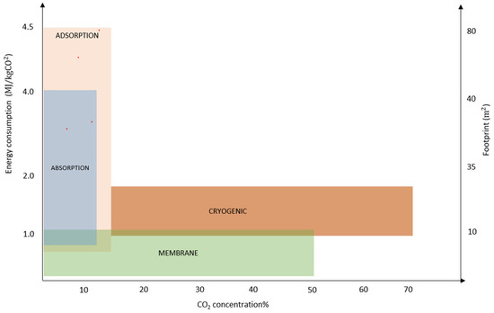 Comparison of CO2 capture technologies (adapted data [40,41,42]).