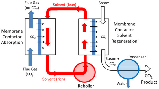 A membrane contactor, having the advantages of a high surface area and high operational flexibility for ease of modularization, is a form of technology that has become a potential candidate for CO2 desorption [50]. The membrane contactor also possesses additional benefits as the gas and solvent have separate flow paths that can prevent foaming, flooding, entrainment, and channeling issues [51]. The membrane contactor technology has also been extensively studied by numerous researchers as it has the advantages of a large surface area for the mass transfer, it is lightweight, and has a small footprint for the system [52].