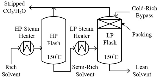 In comparison to other technologies, the flash drum is the simplest form of technology that does not have complex accessories and operations, which lead to the ease of maintenance. Typically, the simplicity of the technology leads to the reduction in the operation expenditure (OPEX). In general, the sizing of the flash drum depends on the flow rate of the gas and liquid that is released from the tank [82]. The higher the flow rate of the gas and liquid released from the flush drum, the larger the size of the flush drum required. In addition, the major drawback of this process is that a series of the flash drums is required for having a high quality of regenerated solvent. A single column of the flash drum is not usually capable of regenerating the solvent as well as the other forms of technology. Moreover, one of the disadvantages of using the flash drum in the regeneration process is the pressure loss of CO2 during the recovery process. Therefore, the flash drum is usually operated at an ambient pressure, which requires an additional compression system to meet the requirement of transferring the gas and liquid product to the pipeline. Figure 7 illustrates the employment of two-stage flash for CO2 regeneration to improve the efficiency and make the process more economical [83]. Despite the excessive footprint, the flash drum still remains the most widely used method for physical solvent desorption.