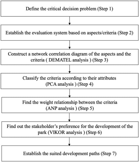 This study adopts the hybrid Multiple Criteria Decision-Making (MCDM) analysis method to understand the satisfaction of HSP stakeholders in the development of the park and introduces suitable development strategies. The hybrid MCDM analytical process consists of seven steps: (1) define the critical decision problem, (2) establish the evaluation system based on aspects/criteria, (3) use the Decision-Making Trial and Evaluation Laboratory (DEMATEL) to construct a network correlation diagram of the aspects and the criteria, (4) use the principal component analysis (PCA) to classify the criteria according to its attributes, (5) use Analytic Network Process (ANP) to find the weight relationship between the criteria, (6) use the VIKOR (Vlsekriterijumska Optimizacija I Kompromisno Resenje) method to find out the stakeholder’s preference for the development of the park, and (7) establish the suited development paths (Figure 1).