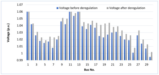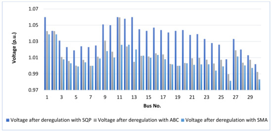 This work was performed by considering the deregulated power environment. The profit shown in Table 3 is the profit of the generation companies. From the objective function, it is clear that social benefit is maximized when GENCOS profit is minimized. Therefore, SMA provides the best social welfare as compared to the other techniques. Figure 5, Figure 6, Figure 7 and Figure 8 display the impact of optimization techniques on system voltage profiles and LMP. After the application of ABC and SMA, the system voltage, as well as LMP, are improved for the entire system.