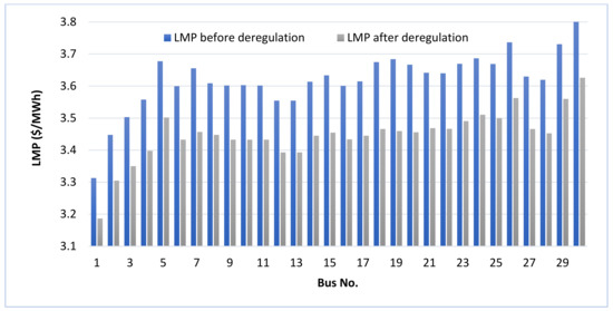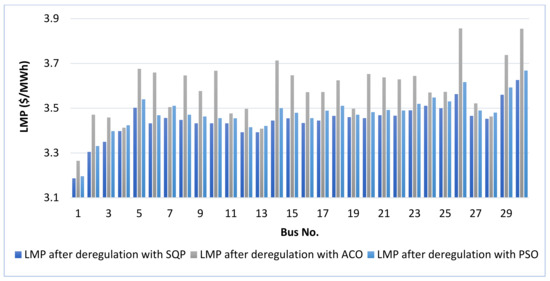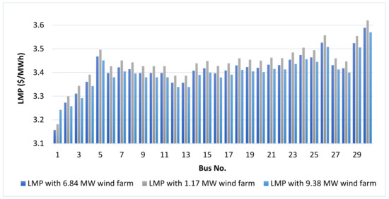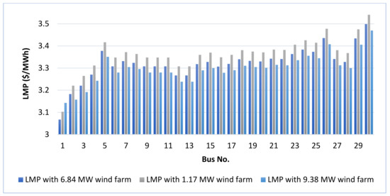 From Table 6, it can be seen that wind farm placement plays a vital role in a deregulated system. The system generation cost is minimum with the integration of the maximum amount of wind power in the system. This placement also affects the supplier’s profit. The supplier profit is maximum with the placement of a high-value wind farm and profit is minimum without the implementation of the wind farm in the system. Figure 9, Figure 10 and Figure 11 display the LMP after the placement of the wind farm in the system. It can be observed that the maximum amount of wind farm integration provides more economic stability to the system by all the optimization techniques. The highest amount of wind farm integration and the application of the SMA optimization technique provide the most economic result for the wind-integrated deregulated power system.