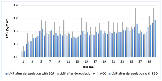 LMP with different optimization techniques (without wind placement) (SQP, ACO, PSO).