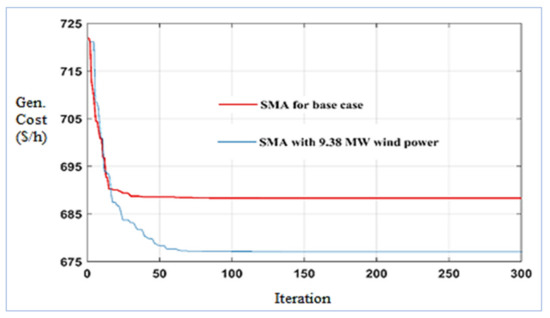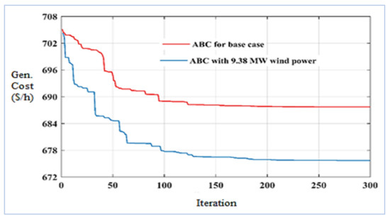 Our main objective is to minimize the system generation cost, which can be achieved by using the SMA. When the generation cost is minimized then social welfare is automatically maximized. From this study, we observed that the maximum amount of wind farm integration along with the optimal concept of SMA provides the highest social welfare and minimum system generation cost. The convergence plots of ABC and SMA with two different situations (i.e., without wind farm and with a maximum capacity of wind farm) are depicted in Figure 15 and Figure 16.