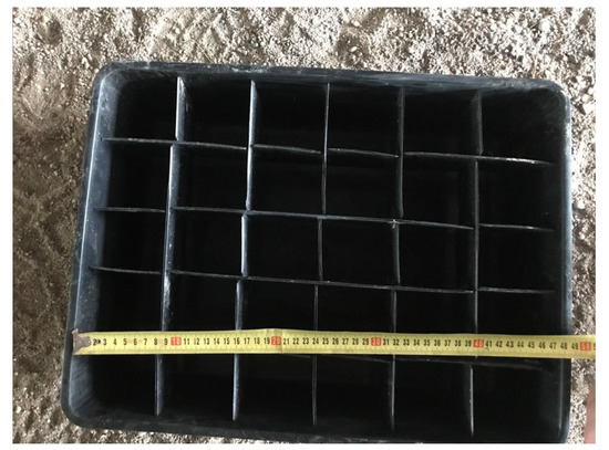 The spread fertilizer was collected over the entire working width of the fertilizer machine to determine the uniformity of the fertilizer spreading. Before the test, special boxes with a gap of at least one meter between them, measuring 500 × 400 × 10 mm, were placed over the entire working width of the fertilizer on the field surface in a line perpendicular to the direction of movement of the fertilizer unit (Figure 2). The row of boxes was arranged so that the direction of movement of the machine coincided with the prevailing wind direction. For tests on spreading lime and granular fertilizer, cardboard dividers were placed in the boxes to prevent the fertilizer from bouncing off the bottom of the box and to collect it evenly. The amount of fertilizer accumulated in each box was weighed on an electronic balance.
