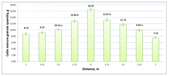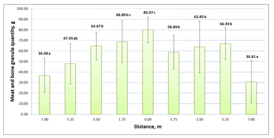 In the analysis of the results of the application of granular fertilizers of cattle manure to the soil, opposite results on uniformity were observed. It can be seen from the results presented in Figure 5 that the amount of organic granular fertilizer ranged from 7.52 g to 16.55 g. The reduction of fertilizer particles in the boxes is observed in both directions from the central fertilizer collection box. The amount of fertilizer in the central box (which was under the spreader) was about 1.9–2.2 times higher than in the side collection boxes 7 m to the left and right of the tractor. In this case, the calculated g2 is 0.46 (p < 0.05), which means that the spreading is smooth and the curve is close to flat. The results of the fertilizer distribution in boxes evaluated by one-way ANOVA showed that the most statistically reliable results are at the center of the manure spreader (distance 0.00 m). The results at the edges of the spreading area are less reliable.